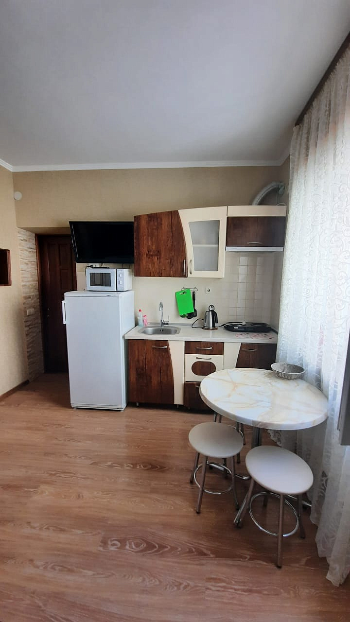 Предлагаем вам комфортабельную однокомнатную студию на втором этаже для троих гостей. В номере двуспальная кровать, диван, кухня, санузел, телевизор, кондиционер и стиральная машинка. На том же этаже находится аналогичный номер.
