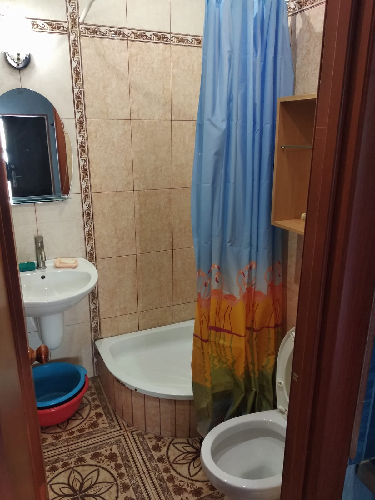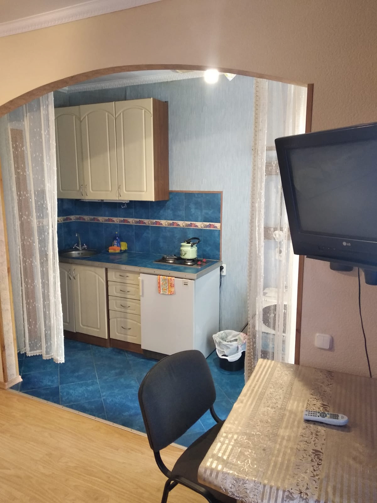 Предлагаем вам комфортабельный однокомнатный номер на втором этаже для троих гостей. В нем есть двуспальная кровать, диван, кухня, санузел, телевизор и кондиционер. Стиральная машина доступна в подсобном помещении для всех номеров. На том же этаже напротив находится аналогичный номер.