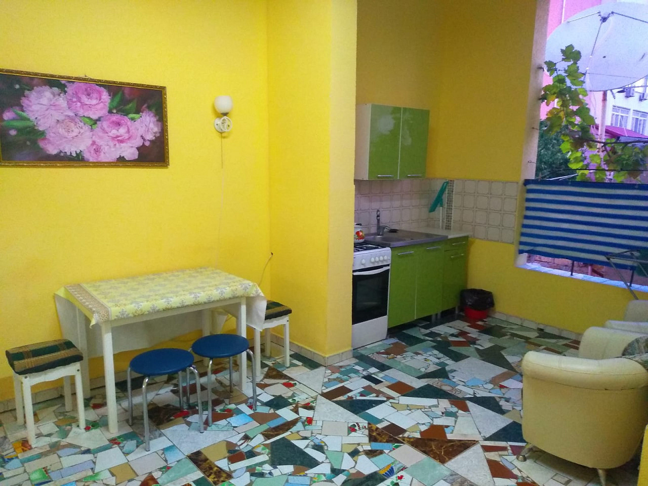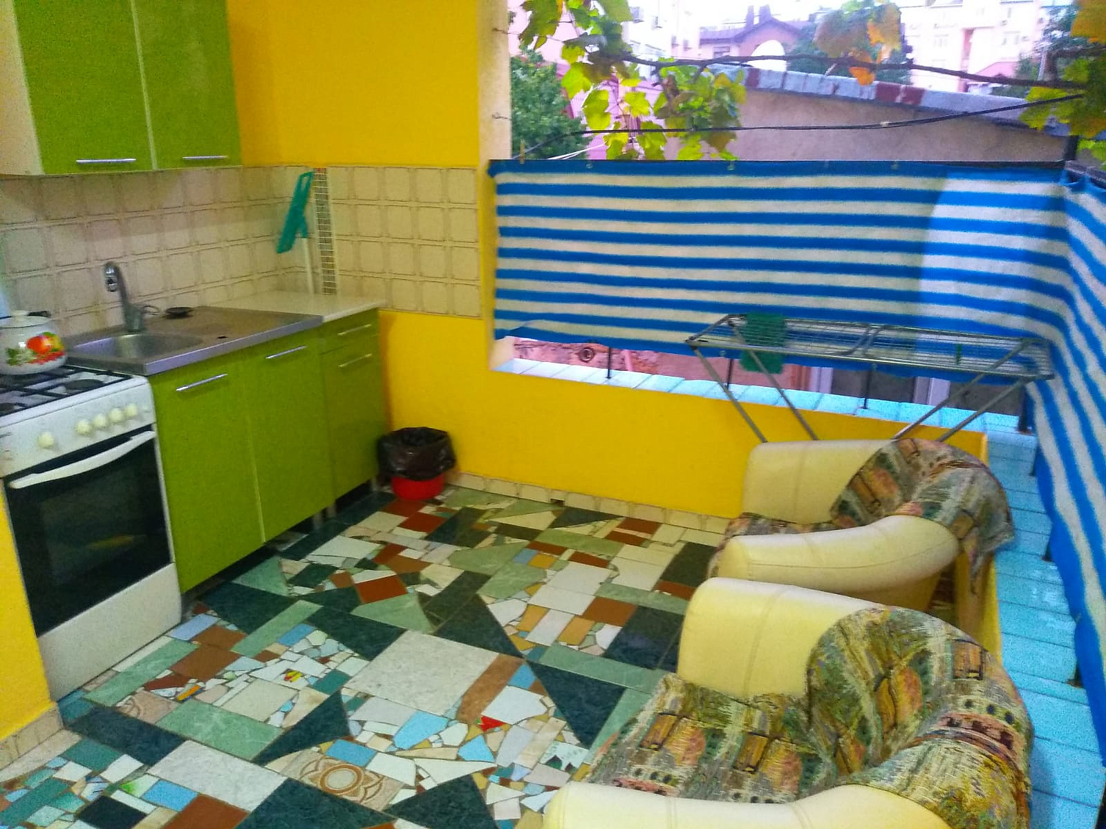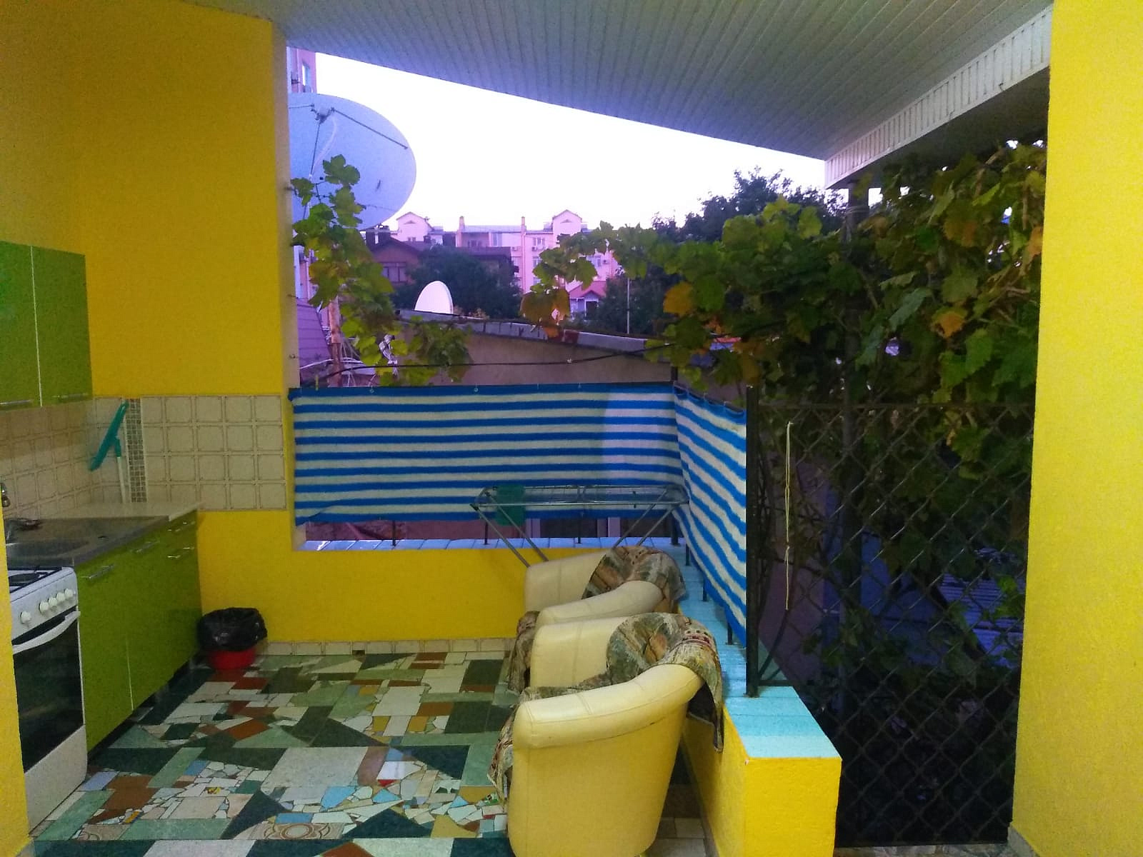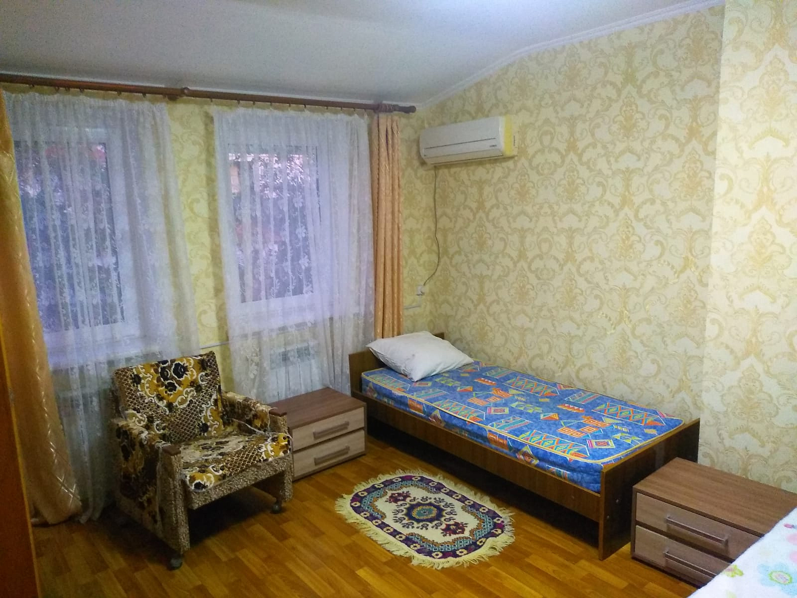 Двухкомнатный номер в частном секторе на втором этаже с террасой и летней кухней на открытой площадке. Есть зона отдыха с обеденным столом. Вход в комнаты раздельный с террасы. Каждая комната оснащена санузлом, кондиционером и телевизором, что позволяет разместить до трех человек в каждой.