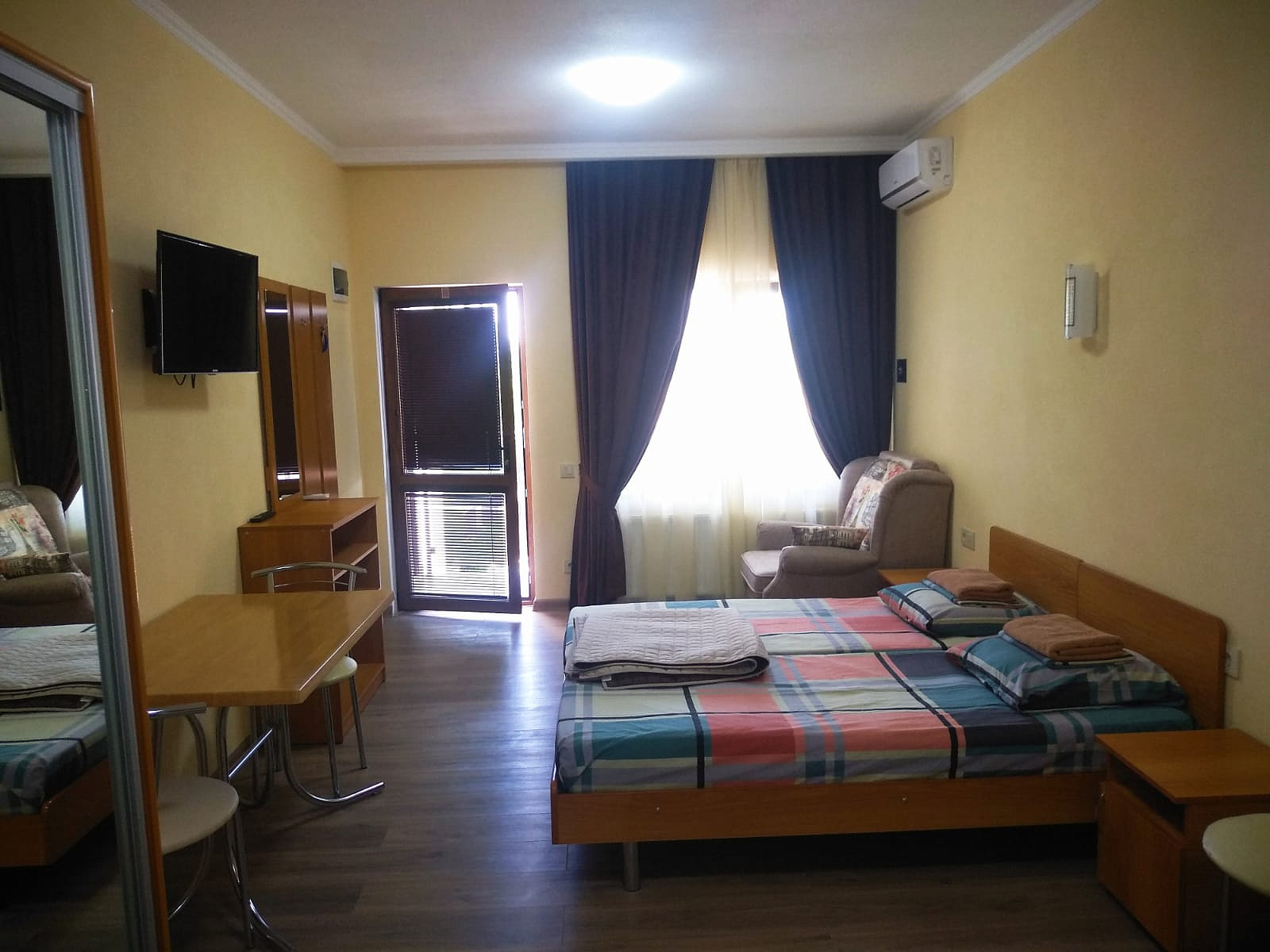 Доступен однокомнатный вариант до 3 человек. В номере — двуспальная кровать, диван, кондиционер, телевизор, балкон.