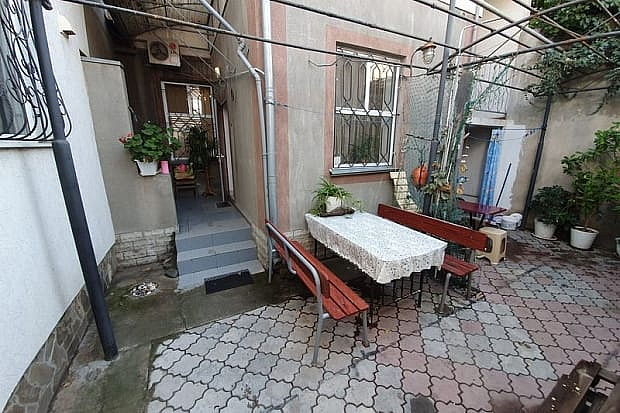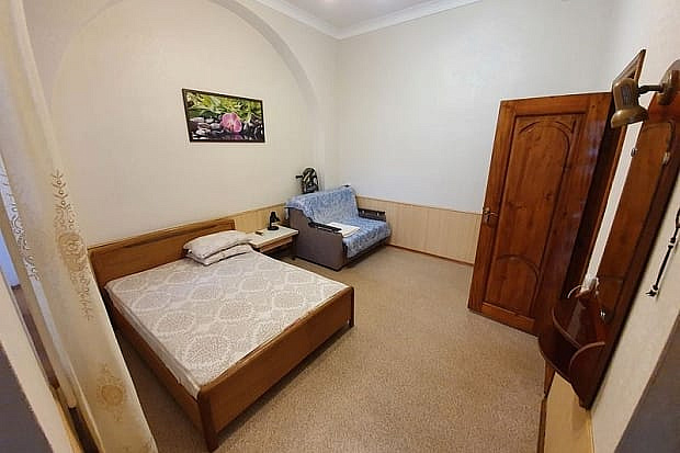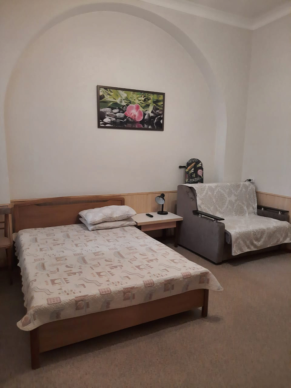 Однокомнатный номер в частном секторе с зоной отдыха в общем дворе. В доме просторная кухня, ванная и санузел. В спальне находится двуспальная кровать и диван, а также кондиционер и телевизор.